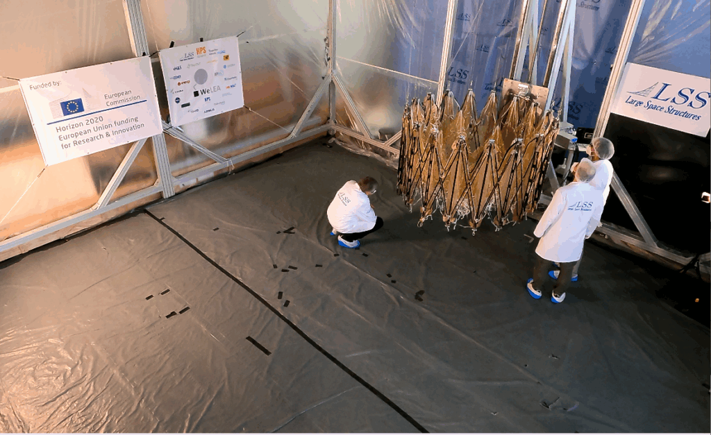 Thanks to the dedicated work of partners (HPS, vH&S, INEGI, FHP, RUAG and TICRA amongst other) and its internal team, Large Space Structures GmbH celebrates a yet major milestone achievement. On 22nd February, 2021, the LEA Protoflight Model (PFM) reflector was deployed at Large Space Structures GmbH Facilities in Eching, Germany.